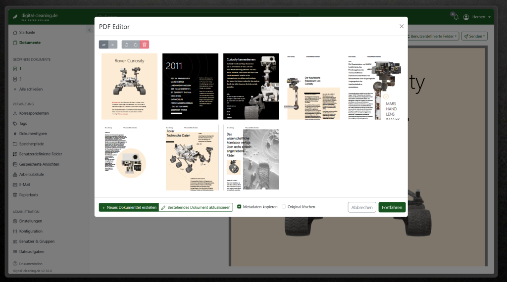 Ab Version 2.18 gibt es auch einen kleinen aber sehr nützlichen PDF-Editor. Wurde schon lange von Anwendern gewünscht, damit man auch bei bereits archivierten Dokumenten noch Änderungen vornehmen kann. Bisher musste man das Dokument downloaden, im Paperless-ngx-Archiv löschen, mit einem externen Tool bearbeiten und neu hochladen. Jetzt genügt ein Klick für die meisten alltäglichen Bearbeitungen.