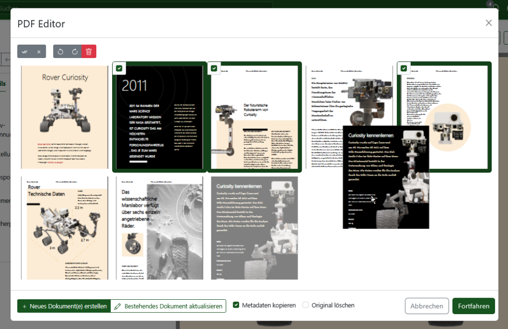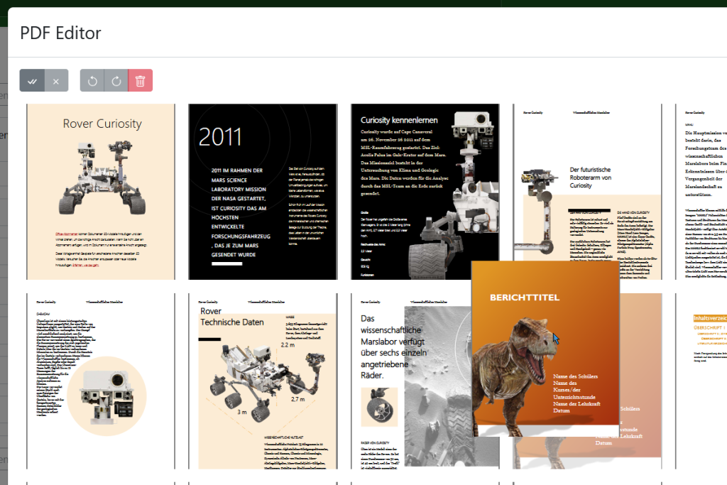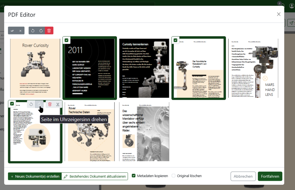 Seiten können gedreht, entfernt oder via Drag-and-Drop verschoben werden: