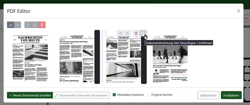Mit der kleinen Schere kann ein Dokument in mehrere Teile „zerlegt“ werden. Im abgebildeten Beispiel entstehen in einem Rutsch drei neue Dateien: