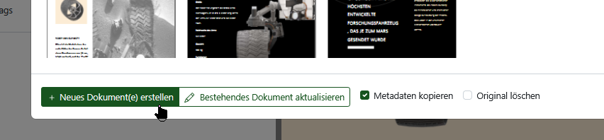 Das so geänderte Dokument kann entweder aktualisiert werden oder als neues Dokument ins Archiv aufgenommen werden. Beim Speichervorgang kann man auch entscheiden, ob das neue Dokument die gleichen Metadaten (z. B. Tags und Speicherpfad) erhalten soll.