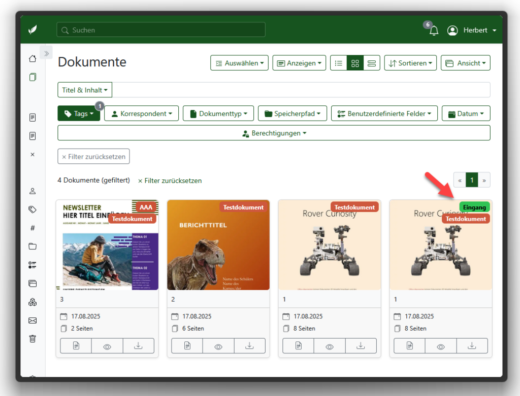Hat man sich für die Erstellung eines zusätzlichen Dokuments entschieden, so erhält dieses den Eingangs-Tag: