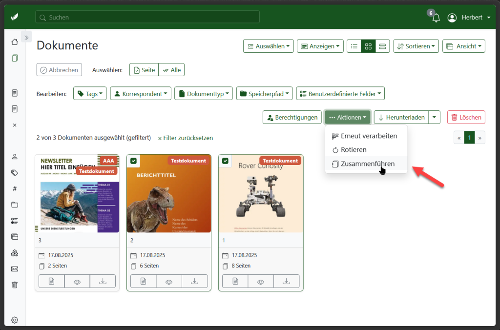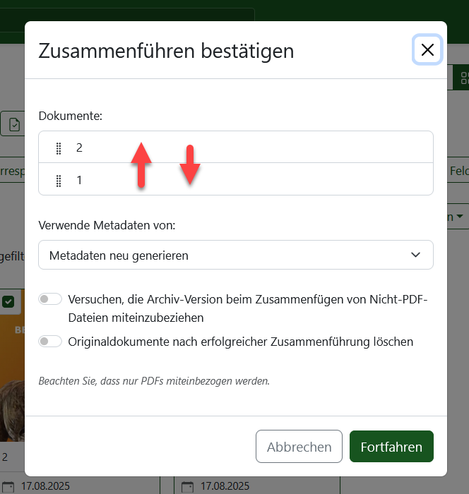 Via Drag-and-Drop kann dabei die Reihenfolge der Dokumente geändert werden: