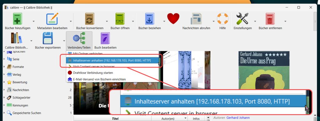 Jetzt soll es aber nur um eine Funktion des Programmes gehen: Mit einem Klick wird Calibre zum Buchserver im heimischen WLAN, so dass von allen Geräten darauf zugegriffen werden kann: