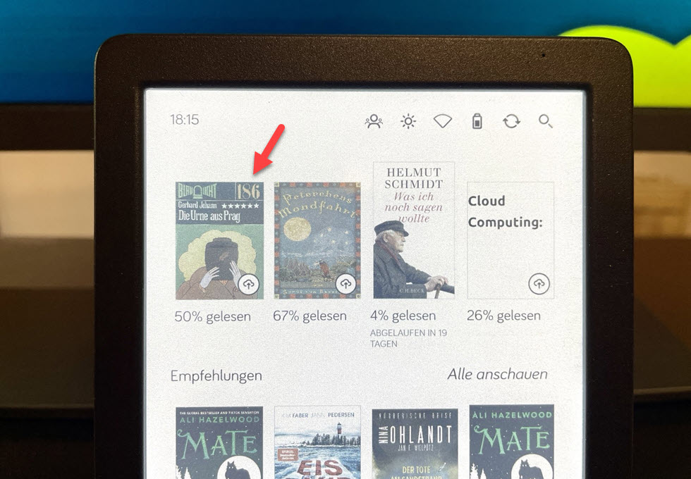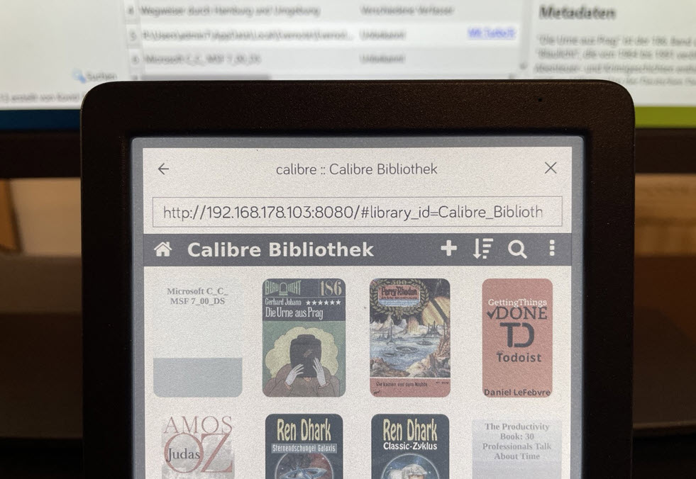 Tipp: Falls der Download eines Buches stockt, kann man die mobile Ansicht von Calibre nehmen. Dazu ergänzt man den Link um „/mobile“. Hier also: „http://192.168.178.103:8080/mobile“. Nach dem Download ist das Buch auf der Hauptseite des Readers zusammen mit Onleihe-Büchern, Vorschlägen der Buchhandlung usw. zu sehen: