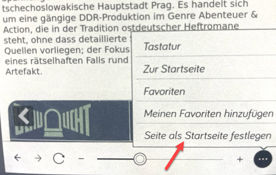 Der Link muss nur beim ersten Aufruf eingegeben werden. Wenn man rechts unten mit dem Drei-Punkte-Menü den Calibre-Link als Startseite speichert, so wird die Bücheransicht später immer sofort aufgerufen.