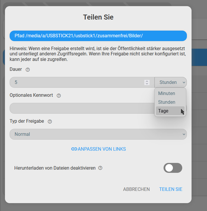 Der Freigaben können mit Ablaufdatum und Passwort versehen werden: