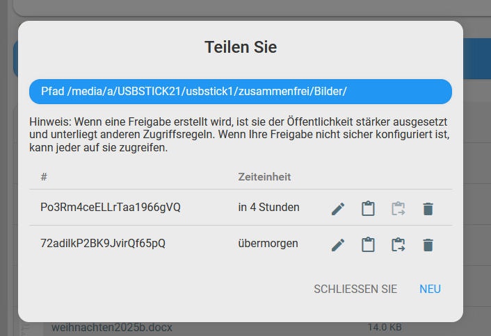 Schön ist, dass es eine „Briefkastenfunktion“ gibt, die nützlich ist für Workshops, Seminare usw. Die Teilnehmer:innen erhalten auf diese Weise einen Freigabelink, mit dem sie Dateien hochladen können, ohne über einen eigenen FileBrowser-Account zu verfügen. Außerdem hat man bei Freigaben die Wahl, ob ein öffentlicher oder ein interner Link erzeugt werden soll. Letzterer ist nur für eingetragene Mit-Benutzer abrufbar.