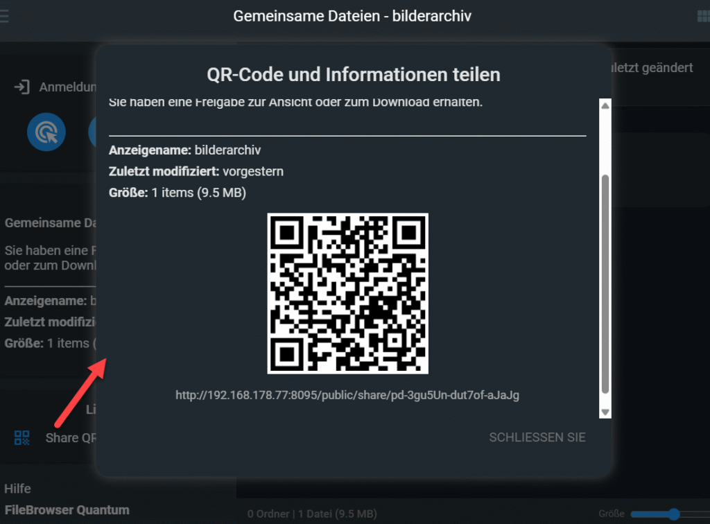 Konfiguriert werden können auf die Menüpunkte der Seitenleiste für den Freigabeempfänger. So lässt sich etwa der Abruf eines QR-Codes für eine Weiter-Weitergabe einblenden: