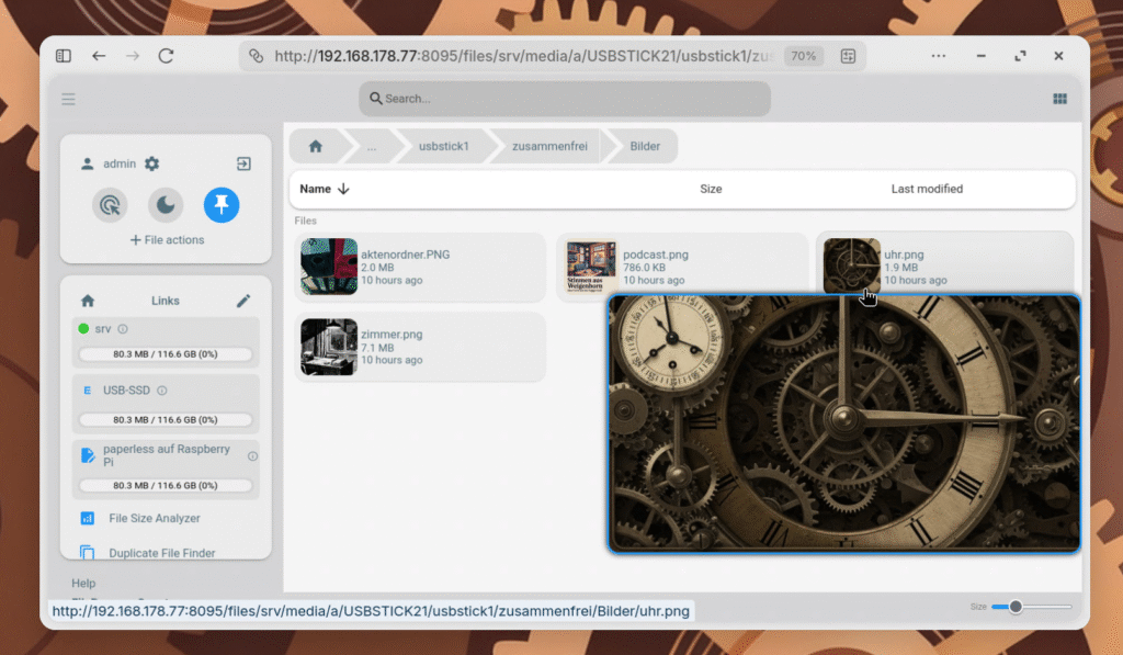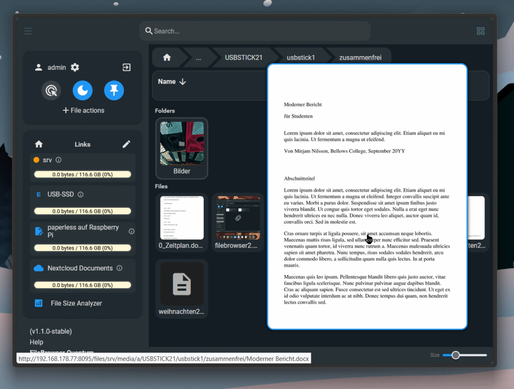 FileBrowser Quantum ist ein Fork des Klassikers FileBrowser (wird nicht mehr aktiv entwickelt) und punktet mit modernen und nützlichen Funktionen. So hat Quantum beispielsweise eine blitzschnelle Index-Suche integriert und kann neben vielen Formaten inzwischen auch (MS-)Office-Dokumente in der Vorschau anzeigen. Vor allem lassen sich auch USB-Speicher und Netzlaufwerke integrieren.
