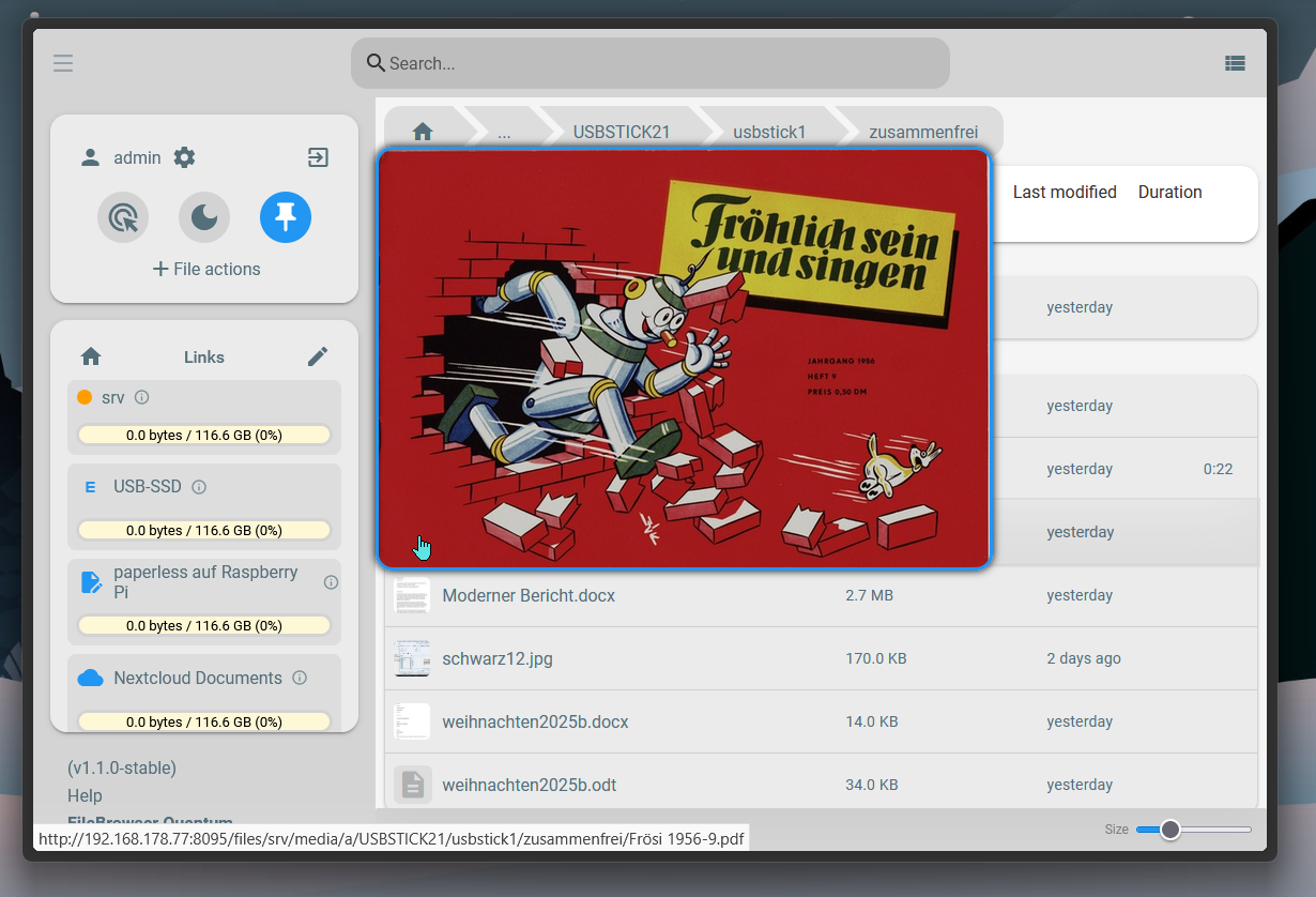Im Screenshot sieht man in der Sidebar den lokalen Speicher, eine USB-SSD, Remotezugriff auf ein Verzeichnis im Netzwerk (Raspberry Pi – Paperless-Ordner) und ein Nextcloud-Pfad. Letzterer wurde über rclone eingebunden, so dass die Dateien auf dem Nextcloud-Server liegen und nicht in einem lokalen Verzeichnis.