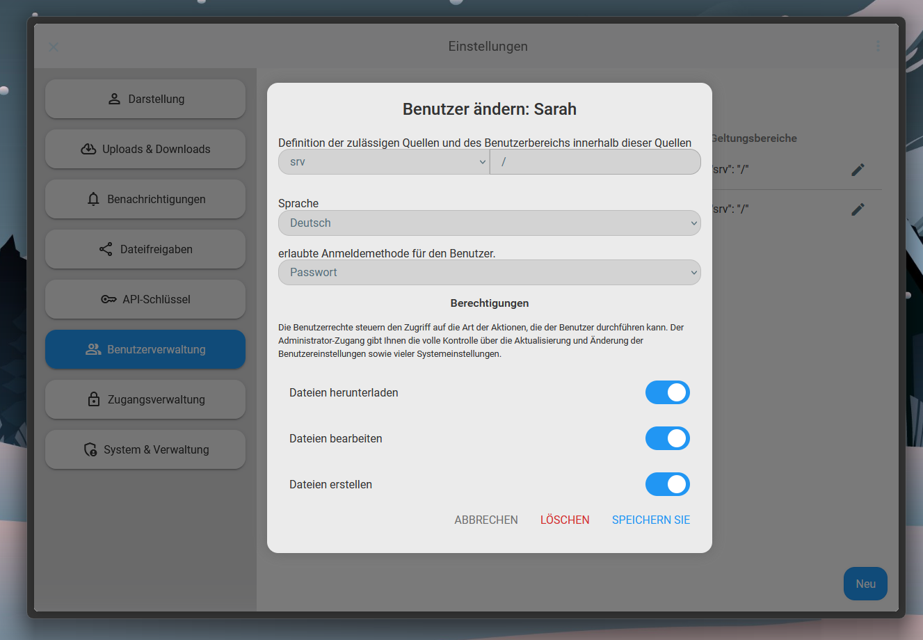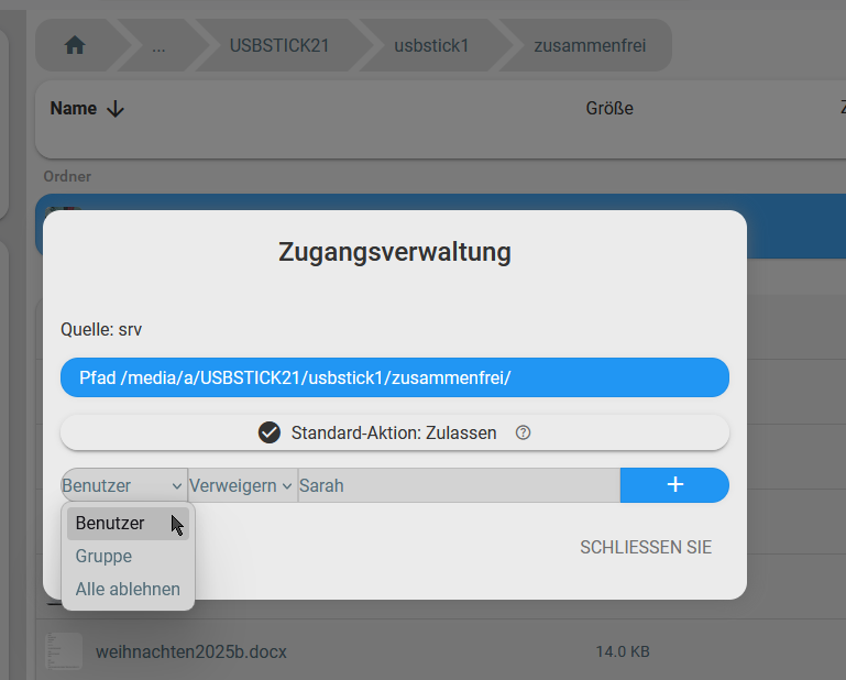 Zugriffsmöglichkeiten können für Speicher-Bereiche nach Nutzern oder Gruppen sehr einfach direkt im Dateimanager eingeschränkt werden:
