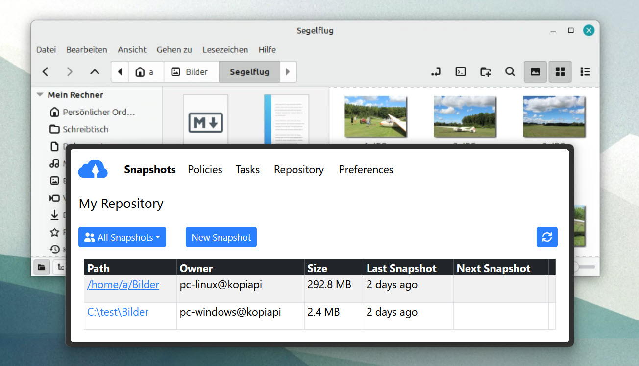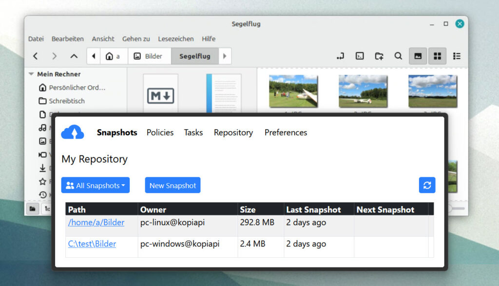Das gleiche Repository kann so z. B. gleichzeitig von einem Windows-Rechner und einem Linux-Rechner bedient werden. Der entscheidende Vorteil: Befinden sich auf beiden Rechnern identische Dateien, so wird nur eine Version gespeichert und damit Speicherplatz gespart. Beispiel: Sie haben den Ordner „Urlaubsbilder“ auf dem Linux-Rechner gespeichert. Auf dem Windows-Rechner haben Sie aber zum Jahresende ein Fotobuch erstellt und daher den Ordner kopiert, so dass sich nun die gleichen Dateien auf zwei Rechnern befinden. KopiaUI bemerkt die Doppelung und speichert nur eine Version zusammen mit der Information, auf welchen Rechnern die Dateien zu finden sind. Sollte also später die Wiederherstellung auf einem bestimmten Rechner notwendig werden, so ordnet KopiaUI die Dateien korrekt dem jeweiligen Rechner zu.