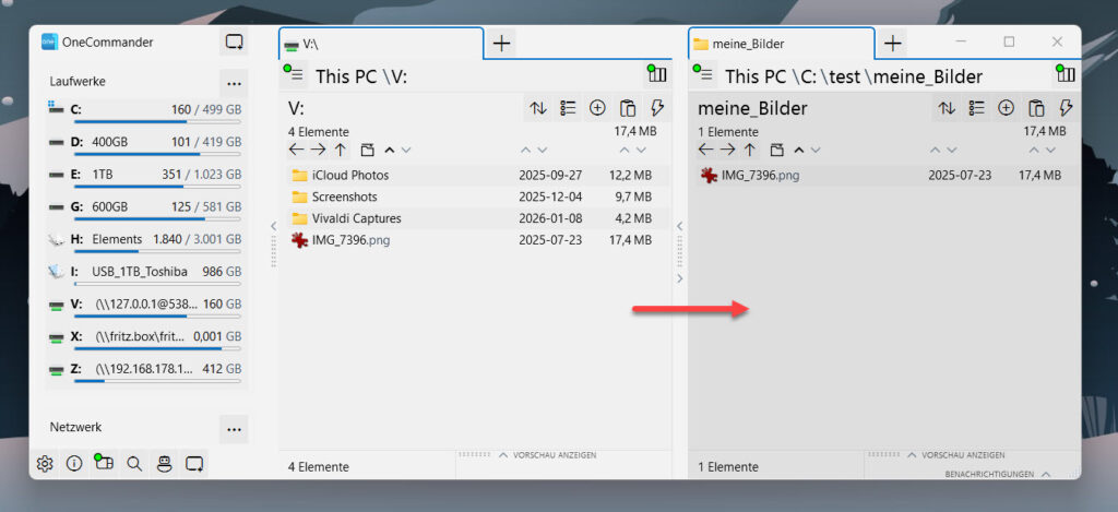 Wohlgemerkt: Der „reale“ Speicherort muss sich für diesen Vorgang nicht auf einem anderen Laufwerk befinden. Die Anzeige im Dateimanager hat den großen Vorteil, dass man direkt aus dem Schnappschuss heraus die Ordner/Dateien an den gewünschten Ort per Drag-and-drop ziehen kann. Ideal, wenn man einen Filebrowser nutzt, der Verzeichnisse in zwei Fenstern darstellen kann.