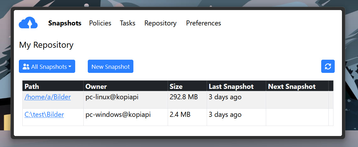 Snapshot: In Kopia ist ein Snapshot eine platzsparende Sicherung der Dateien zu einem festen Zeitpunkt. Bei jedem Schnappschuss werden nur die Änderungen gespeichert. Bei der Wiederherstellung ist es aber so, als hätte man jeweils ein vollständiges Backup erstellt.