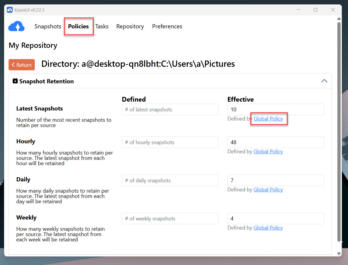 Diese „Aufbewahrungsfristen“ (Rententions) können in KopiaUI sehr fein eingestellt werden. Jeder Schnappschuss erhält automatisch die entsprechenden Markierungen in Form von farbigen Etiketten: