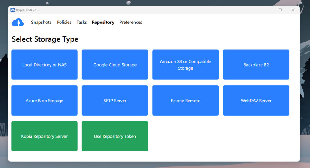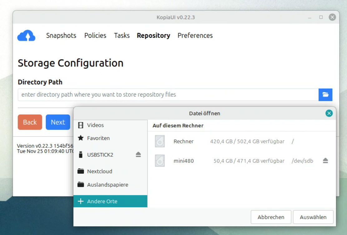 In vielen Fällen dürfte der erste Button – „Local Directory or NAS“ – bereits ausreichend sein. Man wählt einen Zielordner z. B. auf einer eingesteckten USB-SSD. Wenn man die Nextcloud als Ziel möchte, so klickt man auf den WebDAV-Button. Möchte man Backups über einen kleinen Homeserver verwalten – bei mir ist es ein Raspberry Pi -, so greift man zu „Kopia Repository Server“.