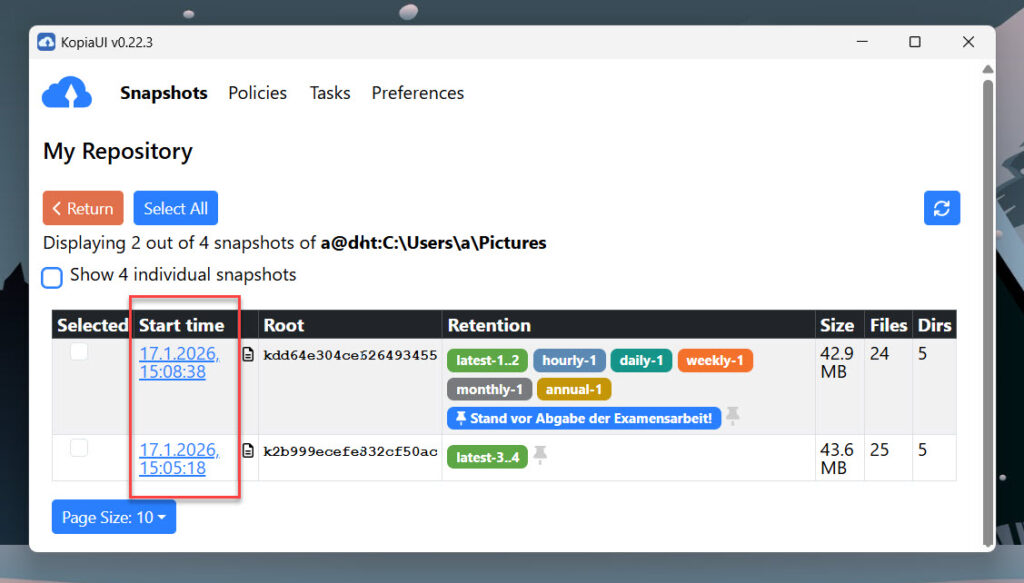 - Die letzten 10: Die allerneuesten 10 Schnappschüsse werden immer aufgehoben, unabhängig vom Alter.