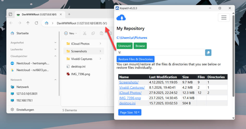 Wenn man nur einzelne Ordner oder Dokumente wiederherstellen möchte, so kann man die Auswahl innerhalb der Oberfläche von KopiaUI treffen. Allerdings gibt es eine sehr komfortable Alternative: Mit einem Klick erstellt KopiaUI ein neues „Laufwerk“, das ausschließlich die Dateien des ausgewählten Snapshots zeigt. Dieses Laufwerk – im Beispiel „V“ – kann im gewohnten Dateimanager aufgerufen werden: