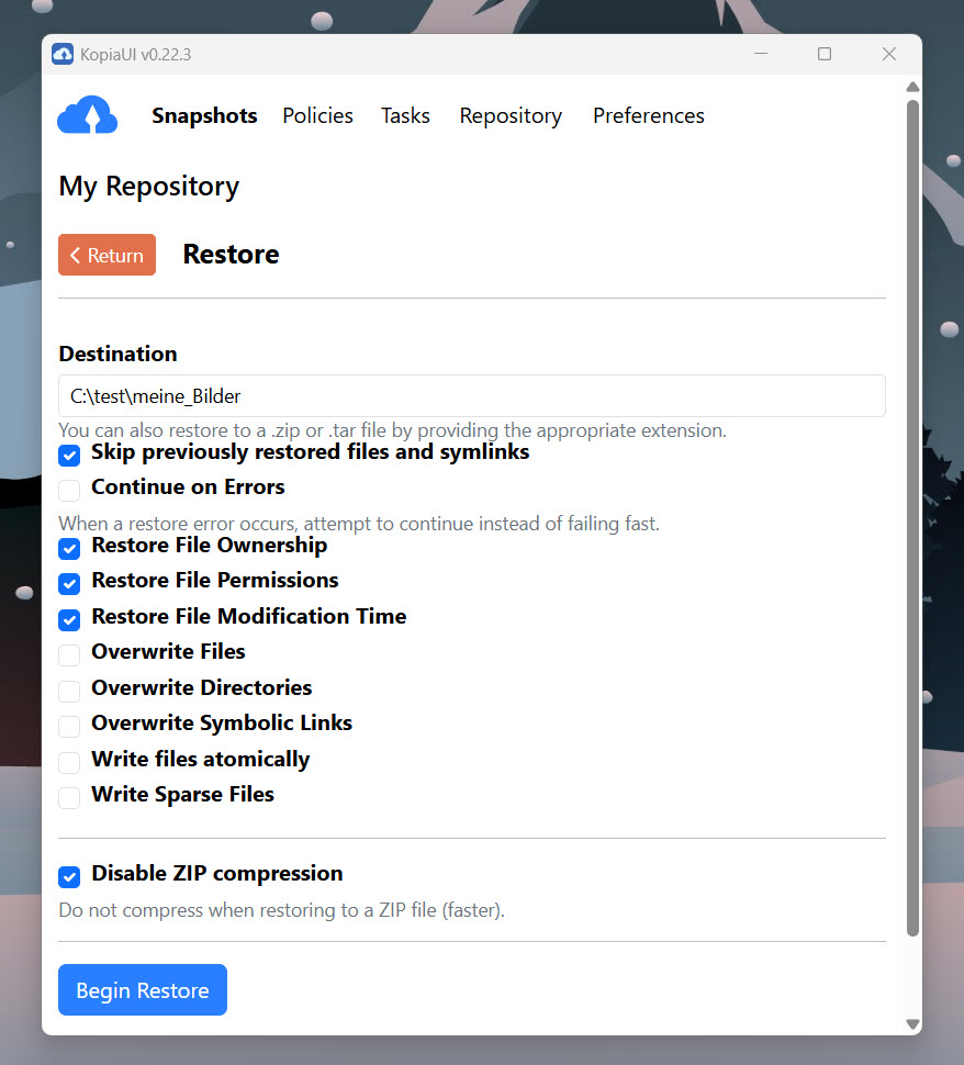Ein Restore kann zunächst so erfolgen, wie man es von anderen Backup-Programmen her kennt: Man wählt zunächst z. B. den letzten Schnappschuss aus, anschließend das Verzeichnis, in dem die Wiederherstellung erfolgen soll (Original-Verzeichnis, alternativer Speicherort, anderes Gerät usw.). Man kann sich von KopiaUI die Dateien auch in ein (Zip-)Archiv packen lassen, um die Sicherung z. B. auf einem Stick mit ins Büro zu nehmen. Zusätzlich lassen sich eine Reihe von Parametern setzen – Dateiberechtigungen, Überschreiben vorhandener Dateien usw. Meist werden die Default-Einstellungen aber ausreichend sein.