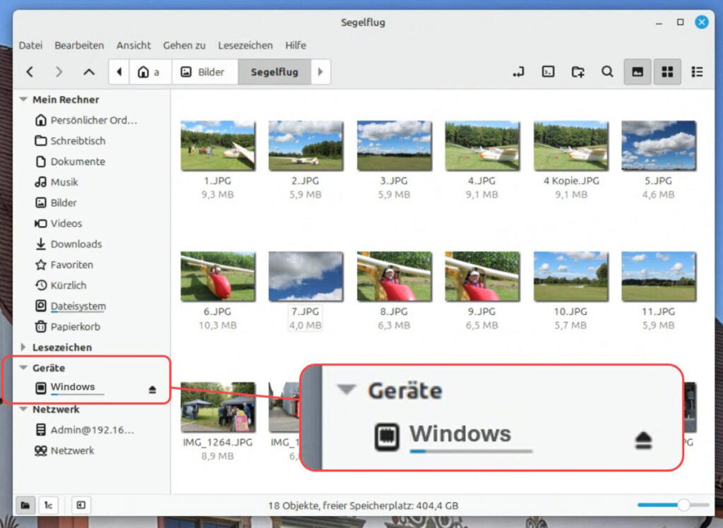 Außerdem werden auf diese Weise die bisherigen (Windows-)Laufwerke automatisch in Nemo eingeblendet. Somit kann direkt auf gespeicherte Dokumente zugegriffen werden und umgekehrt können Linux-Dateien dort gespeichert werden.