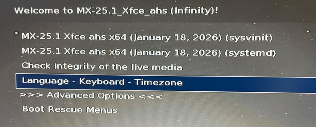 Mit diesem Vorwissen sollte gleich etwas verständlicher werden, was MX Linux beim ersten Bootvorgang abfragt. Die vielen Möglichkeiten können für Einsteiger etwas verwirrend sein. Ich beschränke mich hier auf eine Variante, die ich für das Projekt „Arbeitsstick“ besonders nützlich halte und erkläre die Schritt für Schritt. Also: Stick in den Computer oder das Notebook stecken, darauf achten, dass von diesem Stick gebootet wird.