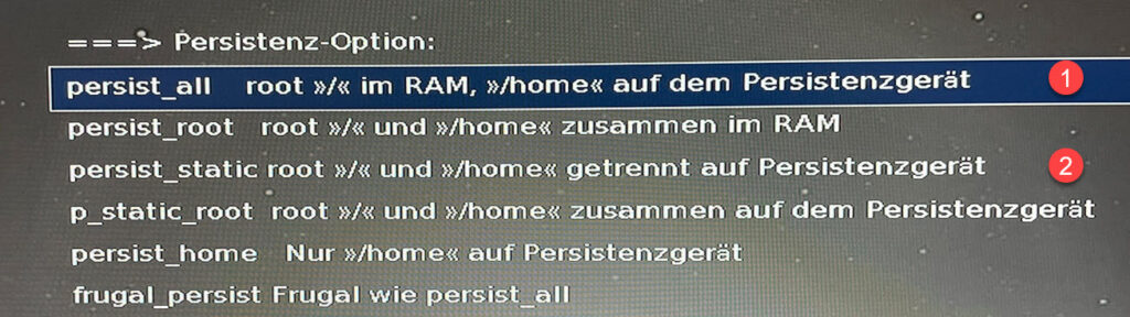Auswahl 1 „persist_all“: Damit werden die Programme ins RAM geladen und damit etwas schneller ausgeführt. Am Ende einer Sitzung muss man allerdings darauf achten, dem Speichervorgang genügend Zeit zu geben (also nicht zu rasch den Stick entfernen). Dokumente und alles andere im /home-Bereich werden hingegen direkt gespeichert.