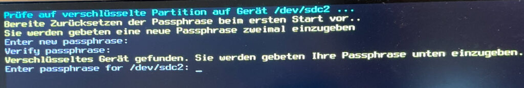 Nun wird das eigentliche System gestartet (Option „sysvinit“, der erste Menüpunkt). Zu Beginn wird nach der Vergabe von Passwörtern gefragt. Im ersten Teil wurde bereits besprochen, dass sich ein längeres und komplexeres Passwort lohnt. Allerdings sollte bedacht werden, dass man dies später aus Sicherheitsgründen häufiger eingeben muss. Ich persönlich finde die Merksatz-Methode ganz gut. Beispiel: „OKfs2020mdT8zD!“ = „Opa Kalle fährt seit 2020 mit dem Traktor achtsam zur Disco!“.[1]