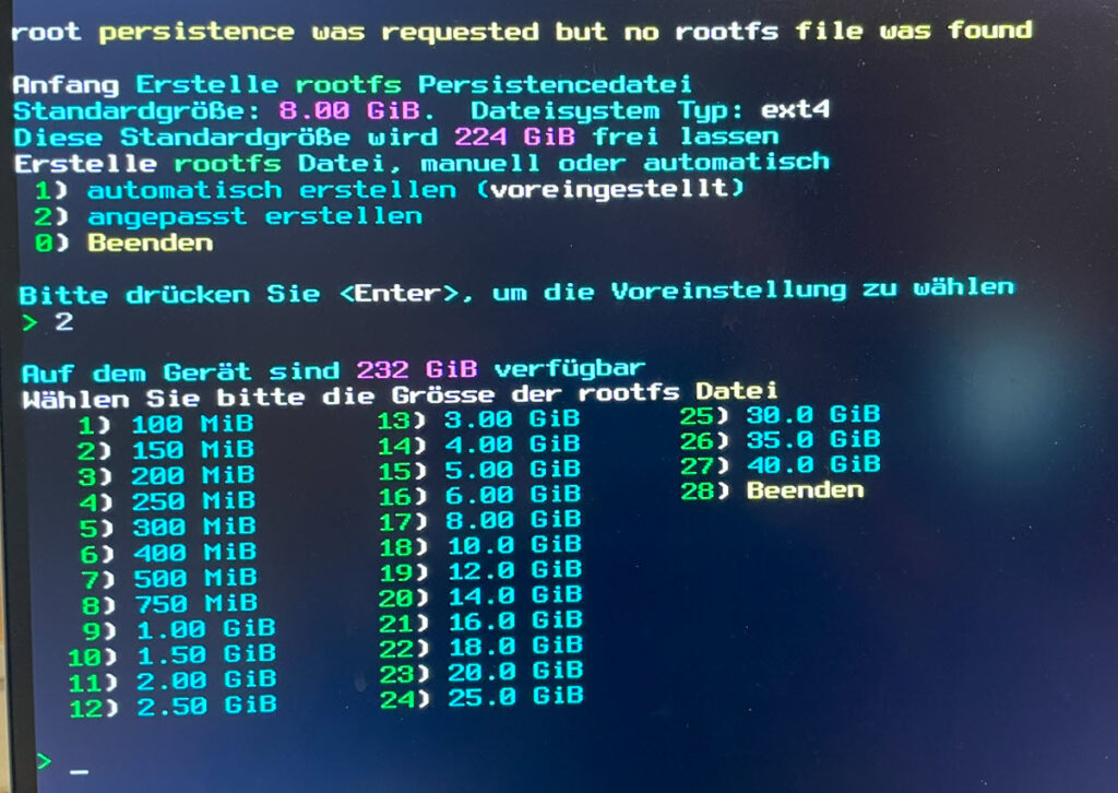 Die eigentliche Arbeit ist damit erledigt, das System konfiguriert nun die Persistenzbereiche. Es gibt noch eine letzte Abfrage danach, ob Änderungen automatisch beim Herunterfahren erfolgen sollen. Ich habe die Option 1 genommen. Wie gesagt, man gibt halt beim Abschluss einer Sitzung dem System ein paar Sekunden Zeit für die Speichervorgänge.