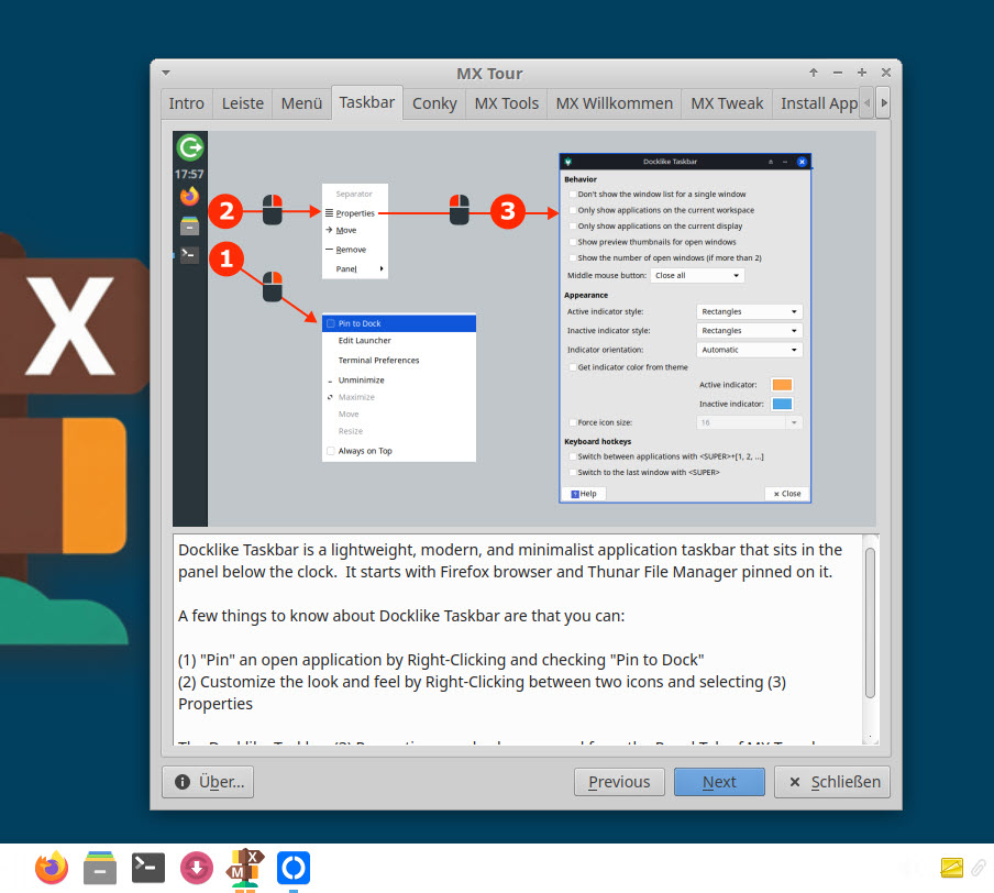 Empfehlenswert ist auch die gut aufbereitete „MX Tour“ (in englischer Sprache). Sehr kompakt werden die wichtigsten Punkte von MX Linux erklärt. Wer also nicht sehr viel Zeit hat, kann sich trotzdem durch diese Tour mit den wichtigsten Funktionen von MX Linux vertraut machen.