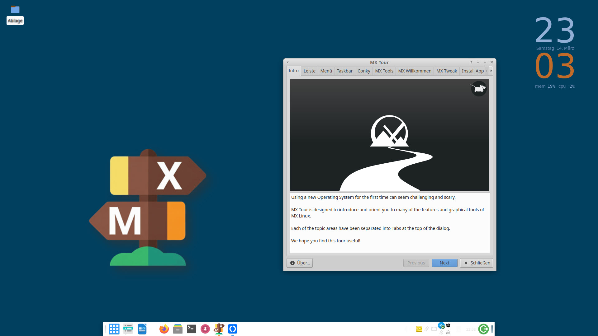 Empfehlenswert ist auch die gut aufbereitete „MX Tour“ (in englischer Sprache). Sehr kompakt werden die wichtigsten Punkte von MX Linux erklärt. Wer also nicht sehr viel Zeit hat, kann sich trotzdem durch diese Tour mit den wichtigsten Funktionen von MX Linux vertraut machen.