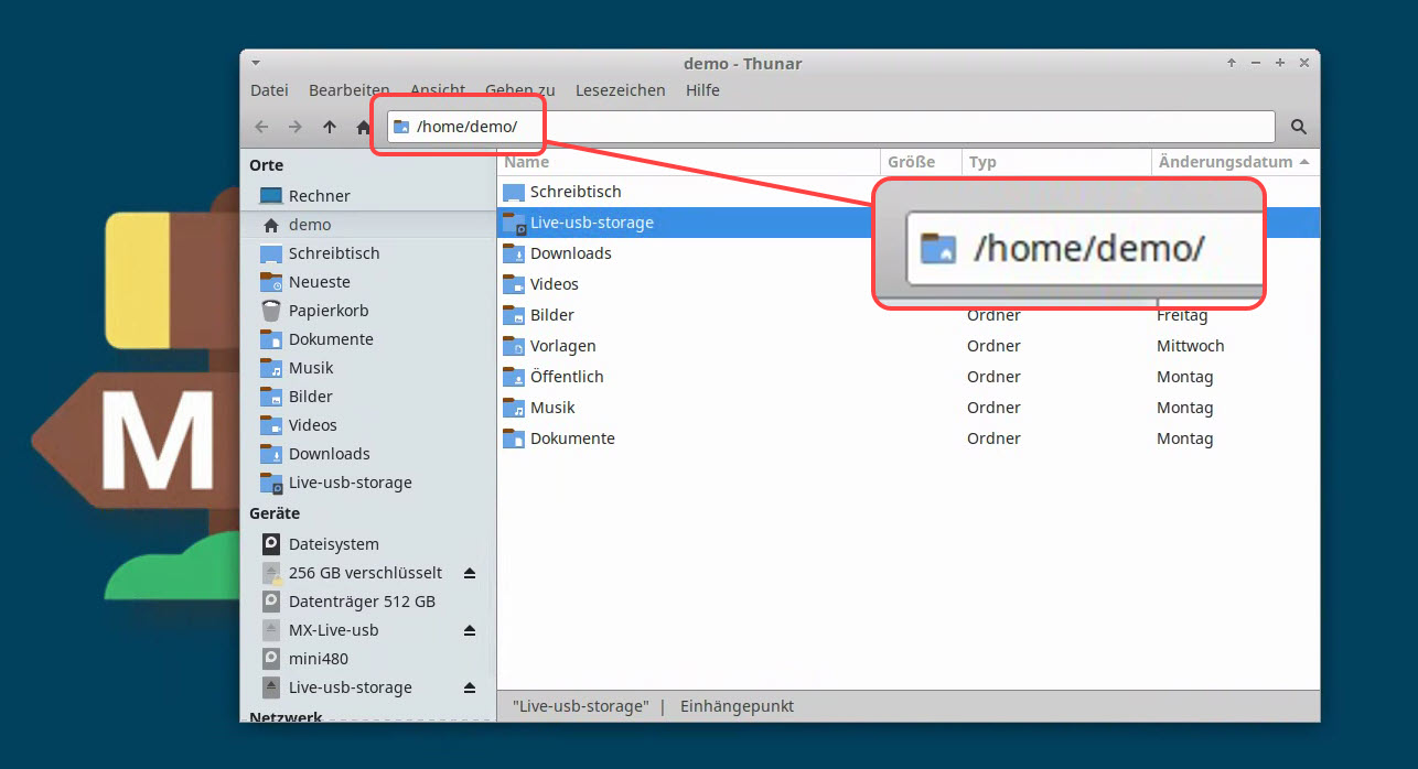Wenn man sich etwas mit dem allgemeinen Linux-Datei-System auskennt, so weiß man, dass mit „Root“ („/“) der Systembereich gemeint ist, der sich mit Installationen, Freigaben, Speicherverwaltungen usw. befasst. Ein Ordner in diesem Teil trägt die Bezeichnung „Home“ („/home“) und führt getrennt Nutzerkonten mit den Dokumenten des jeweiligen Nutzers auf („/home/udo/“, „/home/sarah/“ usw.). MX Linux legt beim Erststart zwei Nutzer an: „Root“ mit Admin-Rechten und „demo“ als einfacher Anwender.