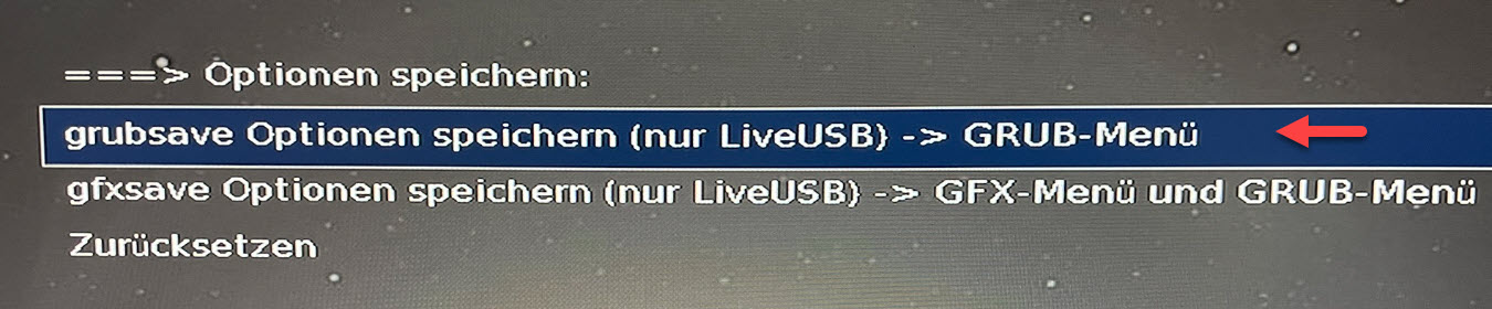 Schließlich noch die vorgenommenen Änderungen speichern. Dazu eine Ebene zurück und „Optionen speichern“ auswählen. Dort die erste „grubsave“ Option wählen: