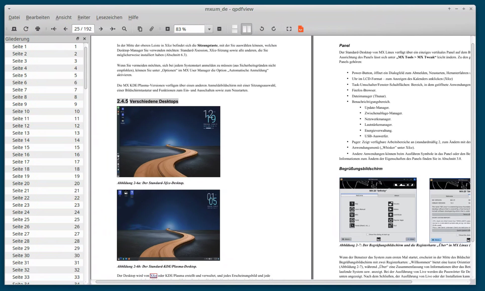 Mit knapp 200 Seiten in deutscher Sprache zur aktuellen Version 25 ist das mitgelieferte Handbuch sehr umfangreich geraten. Dazu gibt es für alle Fragestellungen unzählige weiterführende Links zu Webseiten, Videoanleitungen usw. Hier kann man sich ausführlich über alle Besonderheiten von MX Linux informieren.