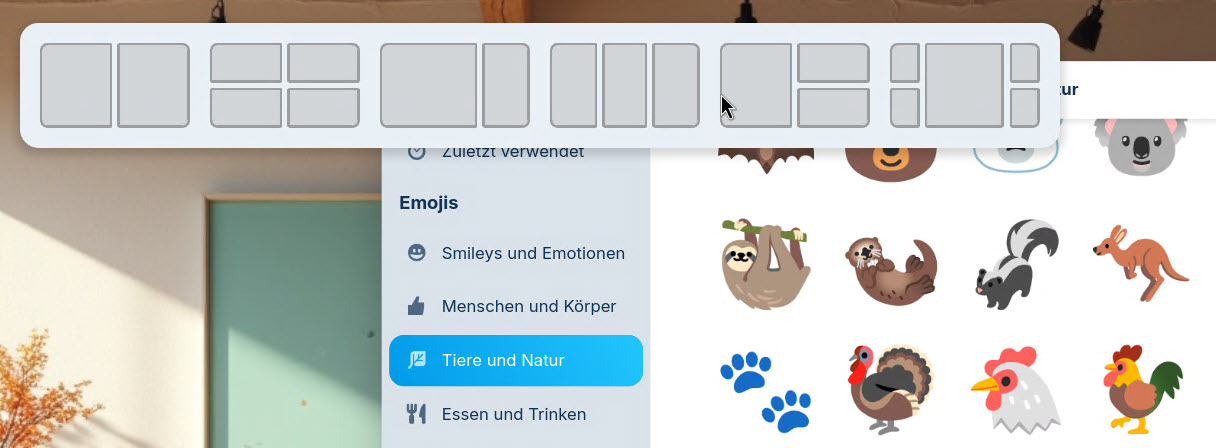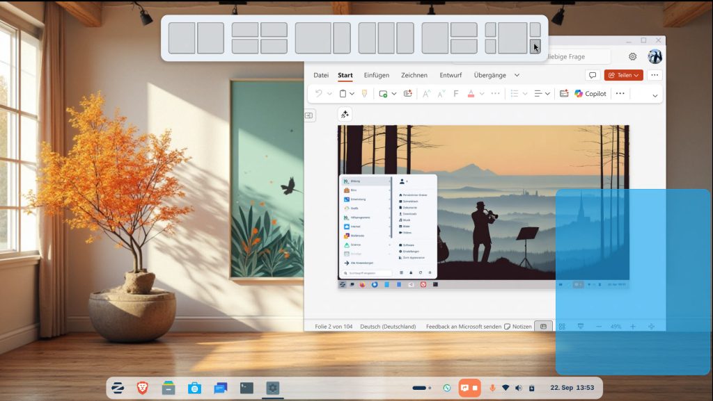 Das Fenster-Snap-Band, das sich öffnet, wenn man eine Anwendung zum oberen Rand führt, verhält sich praktisch identisch mit jenem, das man von Windows 11 kennt. Auch in Zorin 18 kann man eigene Aufteilungen vornehmen – ideal, wenn man mit großen Bildschirmen arbeitet. Ja, auch bei meinem Linux-Mint kann ich mit Tastenkürzel ähnlich Fenster verschieben. Aber das Band macht dies doch deutlich leichter und eleganter:
