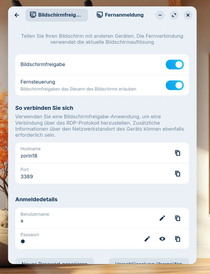 Wenn man auf dem PC mit Windows arbeitet und auf dem Notebook Zorin installiert hat, so kann man mit wenigen Klicks einen Remotezugriff herstellen. Bei Zorin findet man in den Einstellungen den Punkt „Bildschirmfreigabe“. Die schaltet man frei, vergibt Anmeldedaten – fertig. Da seit Windows 10 dort der Punkt „Remotedesktopverbindung“ zur Verfügung steht, kann man beide Systeme mit einem Klick verbinden.