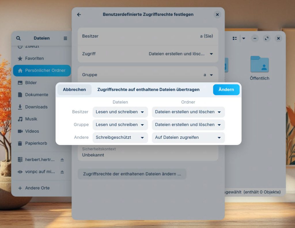 Möchte man einen Zorin-Ordner für andere im Heimnetz freigeben, so ist das auch extrem einfach umzusetzen: Rechtsklick auf Ordner, Berechtigungen auswählen, fertig.