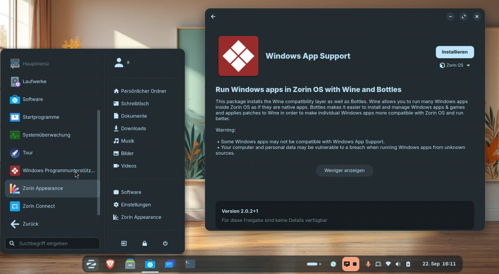 Mit „Wine“ und „Bottles“ kann man Windows-Programme in vielen Fällen unter Linux ausführen. Das Zorin-Startmenü weist darauf hin und ermöglicht es bei Bedarf, direkt diese Komponenten zu installieren. Dabei kommt noch eine Zorin-Besonderheit zum Tragen: Startet man ein Windows-Programm, so blendet Zorin eine kleine Meldung mit Linux-Alternativen ein. So nach dem Motto: „Sie wollen gerade den Windows-Editor X starten – Linux hätte da noch Y und Z zu bieten. Wollen Sie es nicht lieber mit einem echten Linux-Programm probieren?“ Die Zorin-Datenbank wurde unter Version 18 auf rund 170 Alternativ-Vorschläge ergänzt.