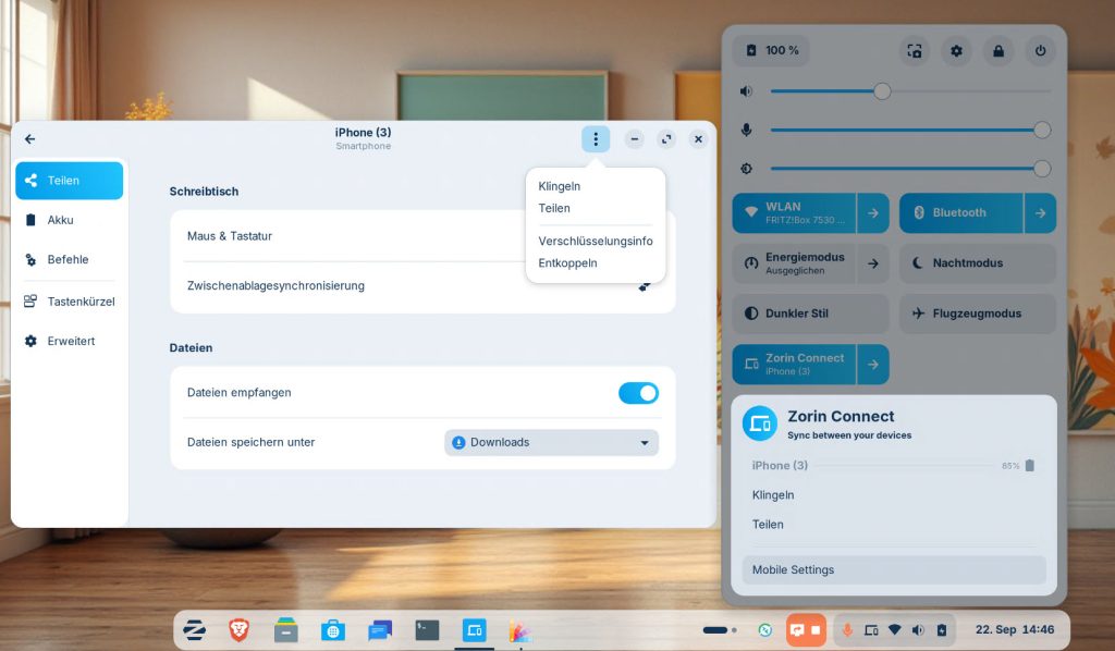Ein kleines Beispiel: Bei meinem Linux-Mint habe ich für den Datei-Austausch mit meinem iPhone KDE-Connect installiert. Kein großes Ding – aber man muss halt wissen, dass es diese Anwendung gibt und schauen, wie man sie installieren kann. Zusätzlich musste ich in Mint ein Applet für den System Tray einbinden, um schnellen Zugriff zu haben. Dies alles ist bei Zorin unter dem Menüpunkt „Zorin-Connect“ bereits vorhanden. Und das alles in einer sehr eleganten und nutzerorientierten Weise:
