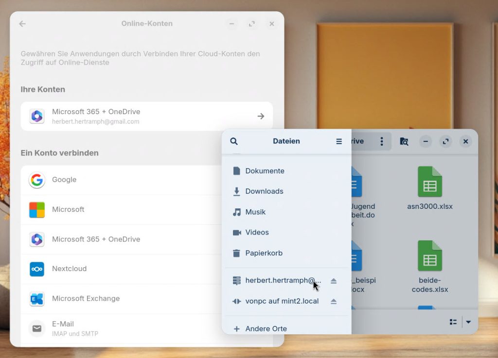 Die Anwendung „Online Konten“ gibt es schon länger, aber erst seit GNOME 46 funktioniert damit der Zugriff auf die Microsoft-Welt. Wenn jemand beispielsweise ein MS-Office-Abo hat, so möchte er ja auf allein seinen Geräten die Dateien von dort abrufen bzw. auf diesem Cloud-Angebot speichern können. Dies ist bei Zorin 18 auch direkt im Dateibrowser möglich: